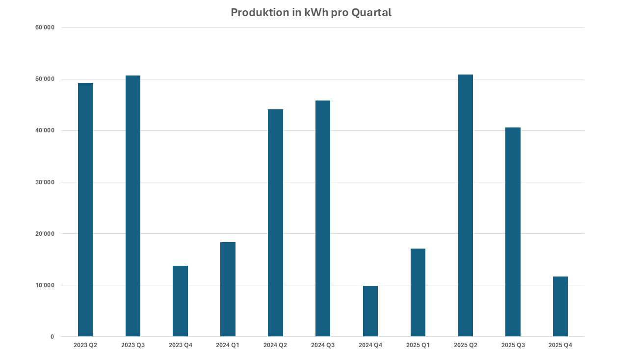 Die 3 Anlagen sind seit April 2023 in Betrieb. Seither werden pro Jahr über 130’000 kWh Solarstrom produziert. Damit könnte der Jahresbedarf von 35 Haushalten gedeckt werden.